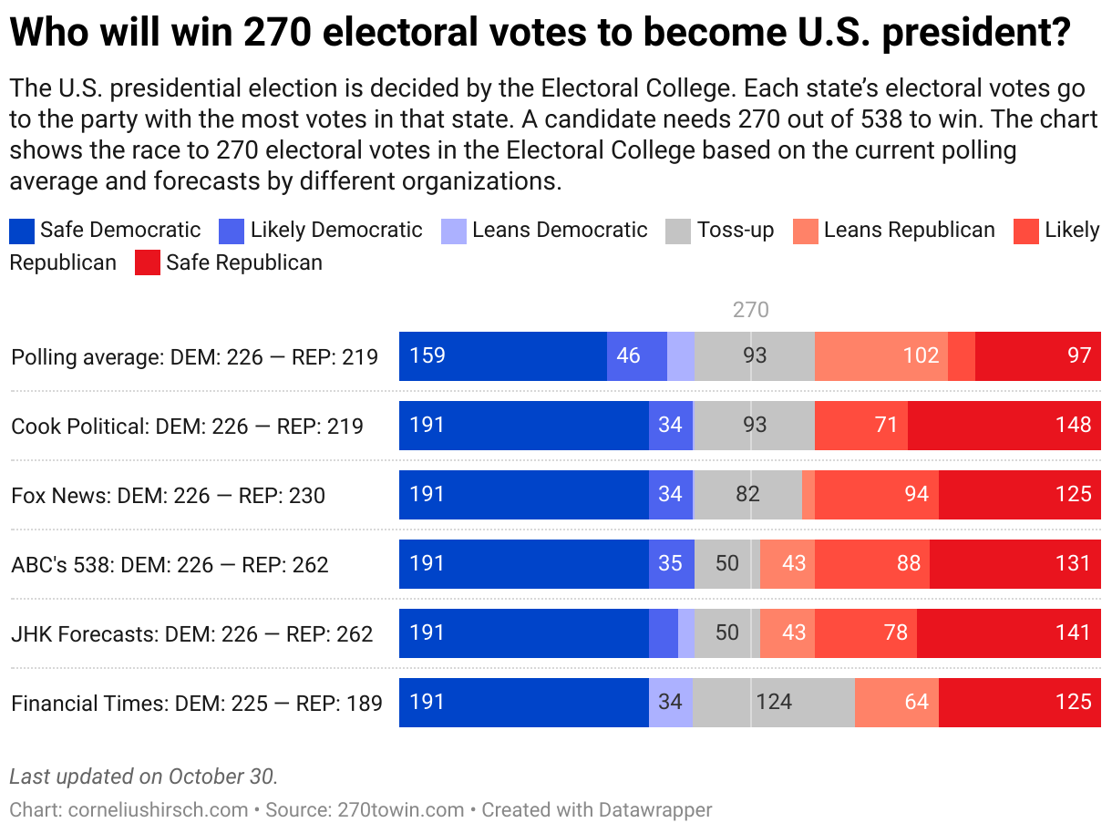 The first chart below tracks their electoral vote count based on current polls, Cook Political Report forecasts, Fox News power rankings, ABC’s 538 model, JHK Forecasts, and the Financial Times electoral votes estimate.