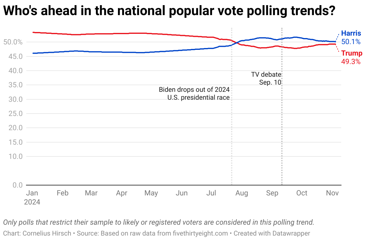 This page provides an overview of the 2024 presidential race between Harris and Trump, summarizing insights from forecasters, U.S. experts, and news outlets in charts and analysis.