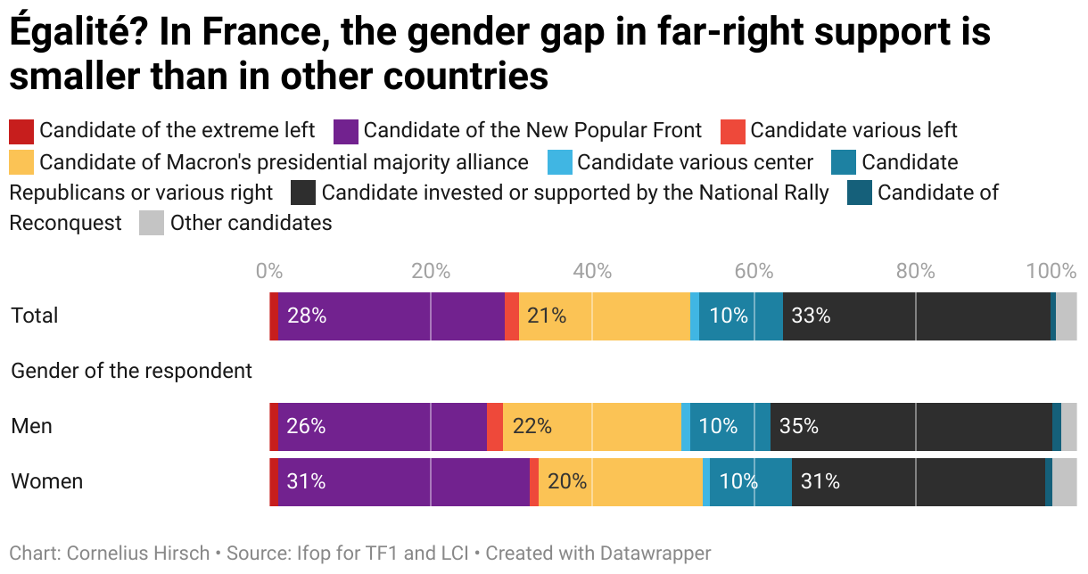 Interestingly, the election data indicates a relatively small gender gap in voting behavior in France. RN won 35% of the vote among men and 31% among women, averaging 33% overall in the first round. This minimal gender disparity suggests that RN’s message and platform have a broad appeal across both male and female voters, contrary to the more pronounced gender divides observed in other countries.