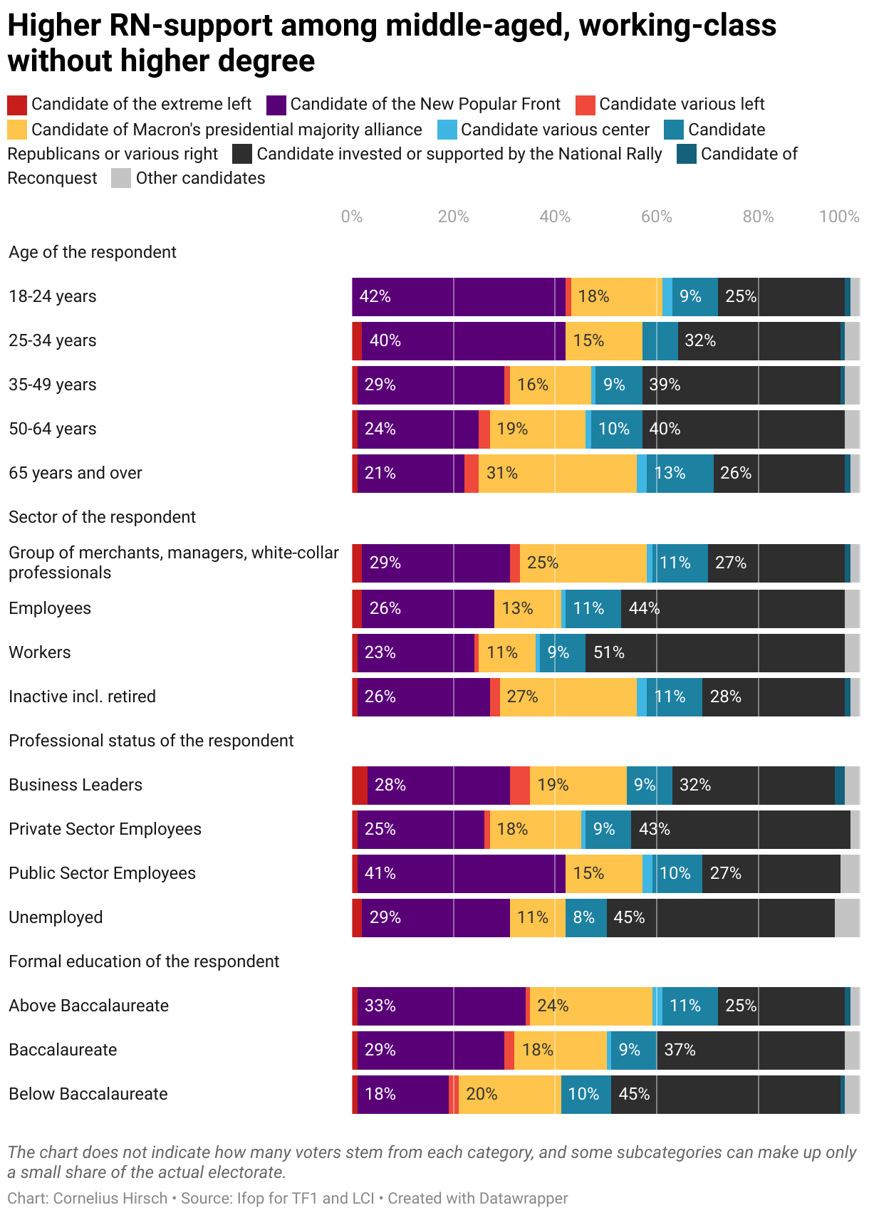 In summary, the RN’s strong performance in the first round can be attributed to its significant support from middle-aged, working-class voters without higher education, as well as its broad appeal across genders. These factors combined to create a formidable base for RN, setting the stage for a highly competitive run-off election.