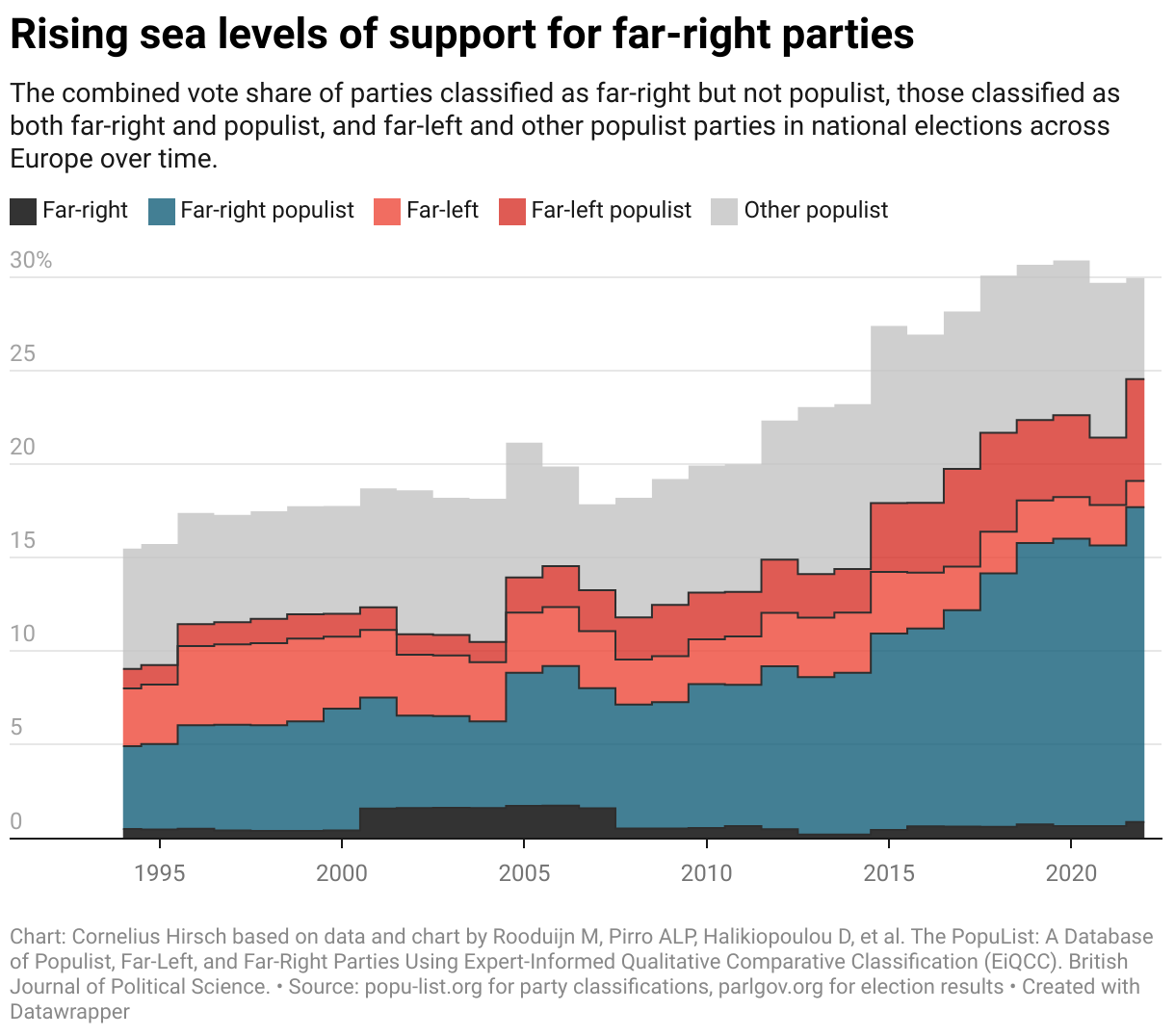 To illustrate the growing support for far-right populist parties in Europe, I reference the analysis by Rooduijn M, Pirro ALP, Halikiopoulou D, et al. (2023). The analysis is based on the dataset from popu-list.org which uses expert classification of where parties are positioned on the political spectrum and whether they can be labeled as populist. The data is combined with the share of votes won by these parties in national elections from the parlgov.org dataset and weighted by the population size of the respective country.