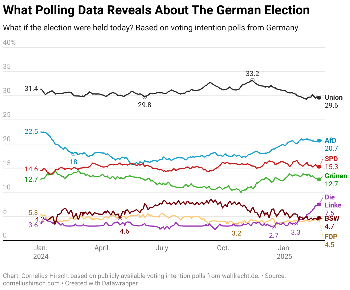 This election will shape Germany’s future at a critical time, influencing both domestic policy and the country’s role in Europe. As we get closer to election day, I’ll continue updating this polling analysis to track any major shifts.