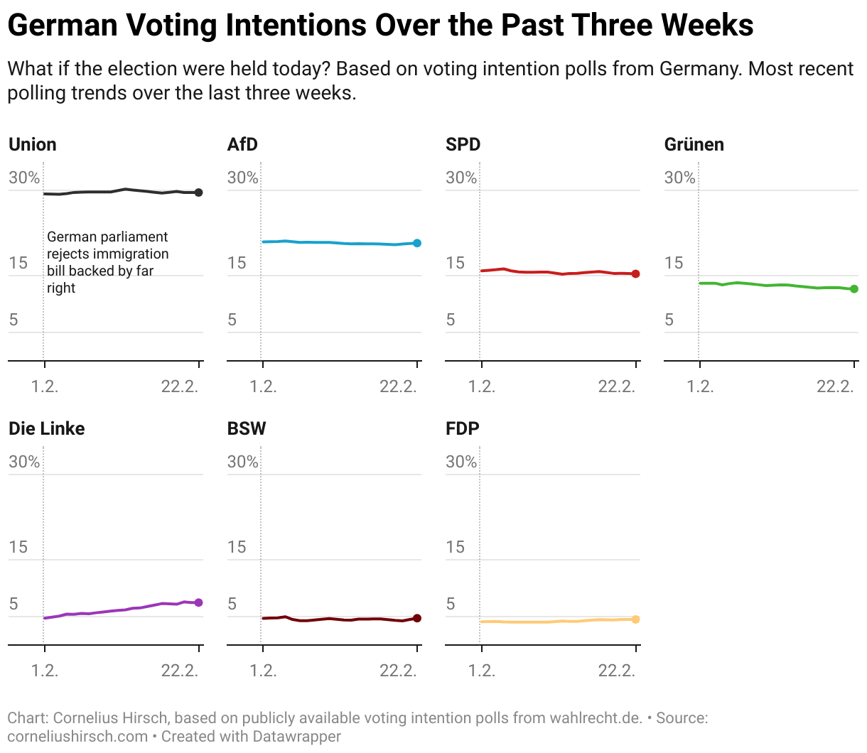 The chart shows the most recent polling Trends ahead of the German snap election and will be updated regularly.